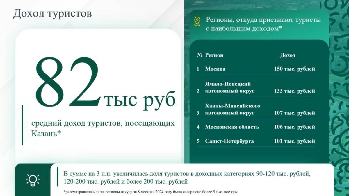 Она также добавила, что уровень дохода туристов в номинальном выражении на 2024 год превышает 82 тысячи рублей, что на 6 тысяч рублей выше показателя 2023 года. Самые состоятельные туристы едут в Казань из Москвы, Ямало-Ненецкого и Ханты-Мансийского автономных округов, а также из Московской области и Санкт-Петербурга.