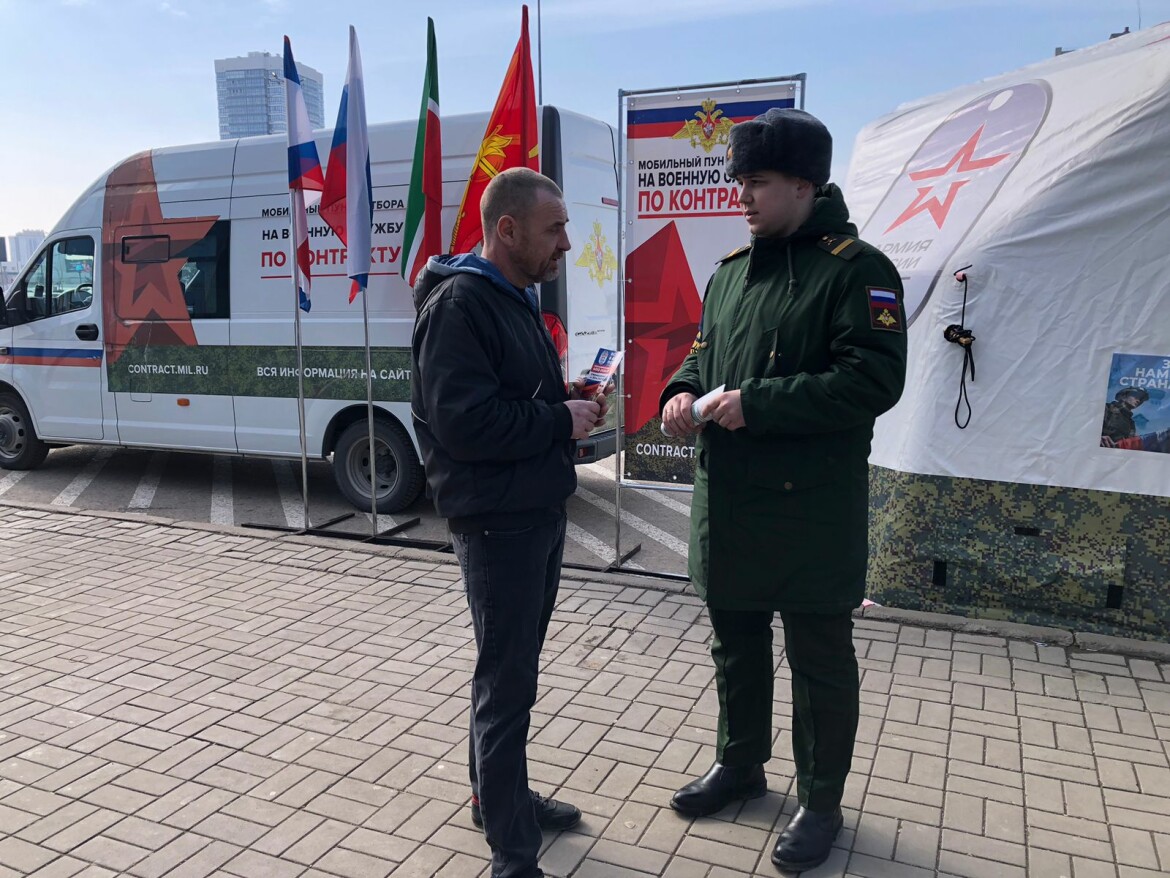 В Набережных Челнах на днях был развернут мобильный пункт отбора на военную службу по контракту. Он расположился возле одного из торговых центров Автограда. Инструкторы объясняли все нюансы работы, отвечали на вопросы, а также раздавали информационные буклеты. Желающие могли на месте написать заявление и заполнить анкету. В среднем за день обращаются 30-40 мужчин.