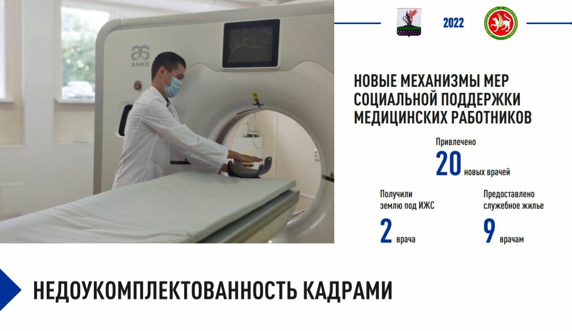 «Острая нехватка кадров в елабужской районной больнице заставила нас искать новые механизмы мер социальной поддержки медицинских работников. В 2021 году было привлечено 20 новых врачей. Двое получили землю под индивидуальное жилищное строительтсво, девяти врачам предоставлено служебное жилье», — отметил спикер.