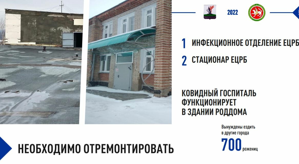 «Состояние здания инфекционного отделения ЕЦРБ, построенного в 1975 году, не позволило разместить в нем ковидный госпиталь, поэтому с мая 2020 года госпиталь функционирует в здании роддома. В связи с этим роженицы района (около 700 человек в год) вынуждены ездить в Набережные Челны и в Нижнекамск. Вследствие протекания кровли в стационаре ЕЦРБ происходит затопление палат, где находятся тяжелые пациенты, возникает риск возгорания и поломки дорогостоящего оборудования», — доложил глава района.