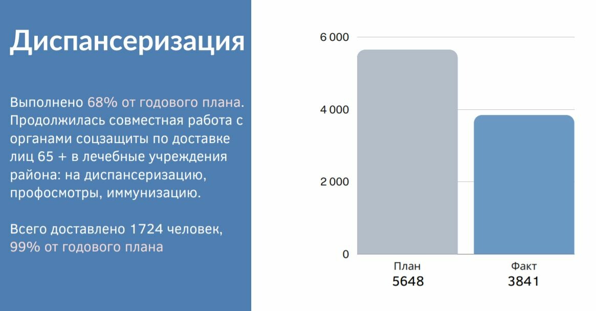 Почти 4 тыс. человек прошли диспансеризацию. По национальному проекту «Демография» в 2021 году на диспансеризацию, профосмотры и иммунизацию в больницы были доставлены 1724 человека в возрасте старше 65 лет.