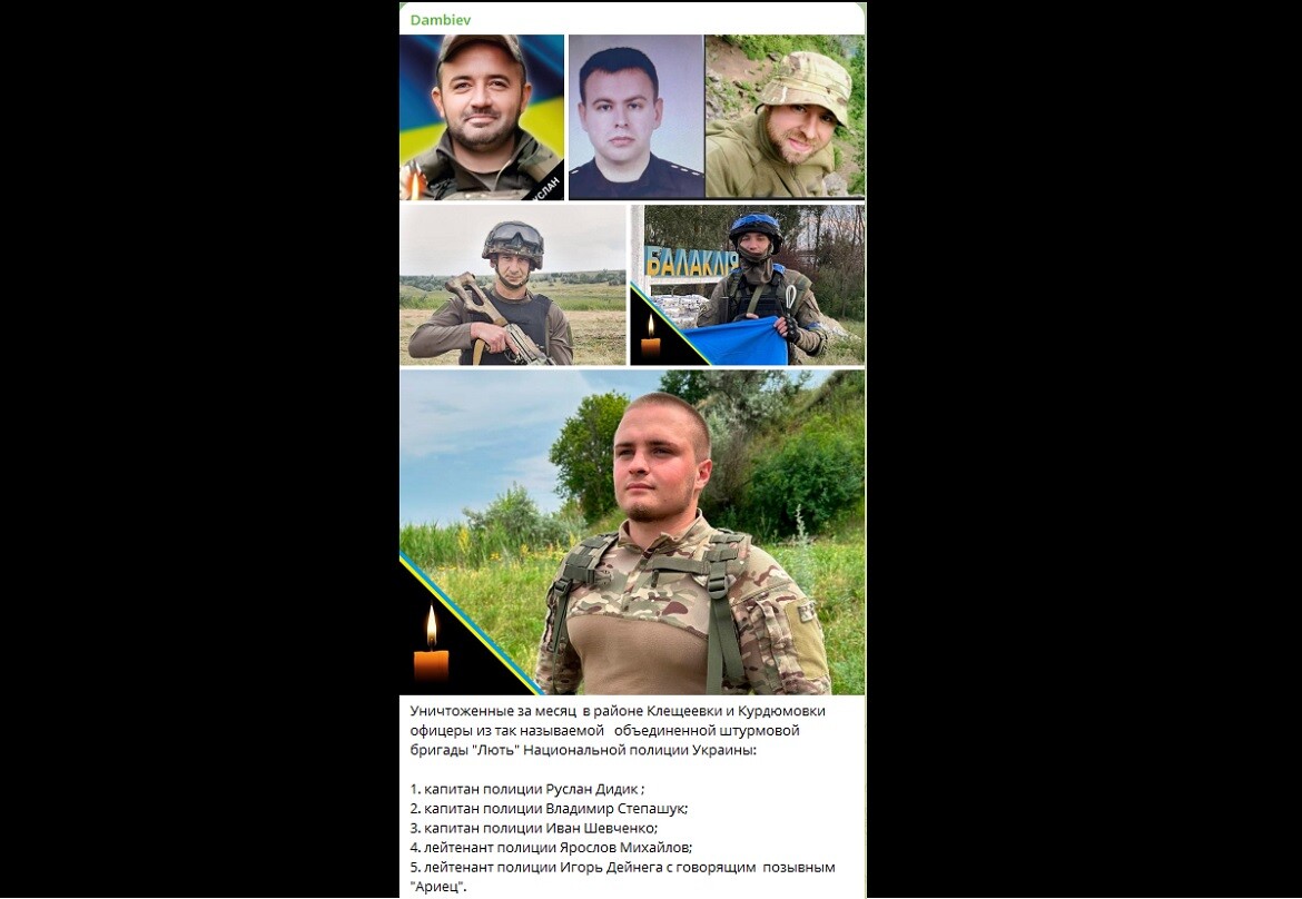 «Уничтоженные за месяц в районе Клещеевки и Курдюмовки офицеры из так называемой объединенной штурмовой бригады "Лють" Национальной полиции Украины: капитан полиции Руслан Дидик; капитан полиции Владимир Степашук; капитан полиции Иван Шевченко; лейтенант полиции Ярослов Михайлов; лейтенант полиции Игорь Дейнега с говорящим позывным "Ариец"», – сообщил журналист.