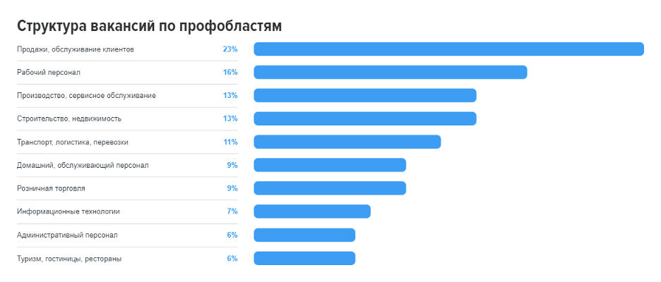 «Основной спрос на кандидатов сосредоточен в нескольких профессиональных группах: рабочий персонал, производство, сервисное обслуживание; продажи, обслуживание клиентов, розничная торговля; строительство и недвижимость. Получается, работодатели из разных отраслей фактически конкурируют за одних и тех же людей на рынке труда», – отметили в пресс-службе hh.ru Поволжье.