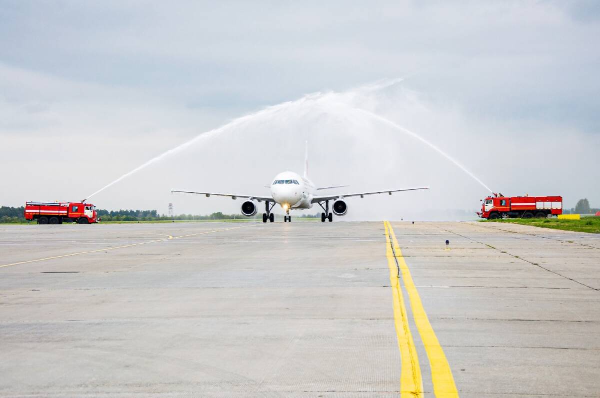 По авиационной традиции первый борт после приземления встретили водяной аркой, созданной на рулежной дорожке с помощью брандспойтов пожарных автомобилей.