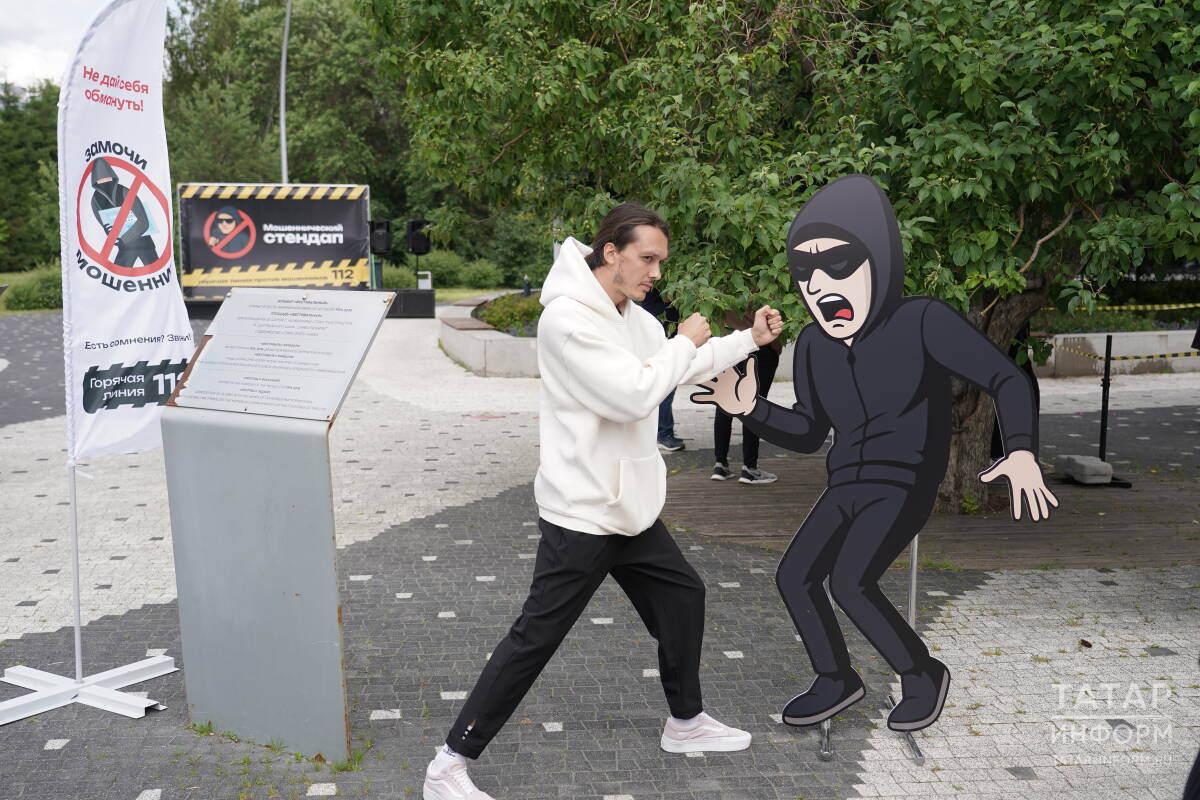 Первое из развлечений — силомер «Бей по мошенничеству»: посетителям выдалась возможность в прямом и переносном смысле «ударить» по аферистам. Отдельная зона-интерактив, где каждый человек мог бросить шарик с водой в актера, переодетого в мошенника. Для разнообразия на площадке установили фотозоны с изображением мошенника и полицейских с табличкой и информацией о горячей линии. Также каждый желающий мог сделать своими руками деревянный значок с логотипом мероприятия и забрать его на память, нанести временное тату как символ борьбы с обманом.
