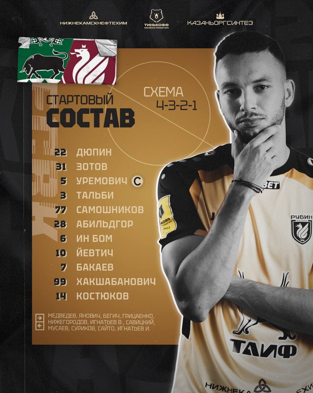 Тальби сыграет в центре защиты вместе с капитаном команды Филипом Уремовичем. В остальном состав казанского клуба будет таким же, как и в матче 5-го тура РПЛ против «Химок» (1:1).