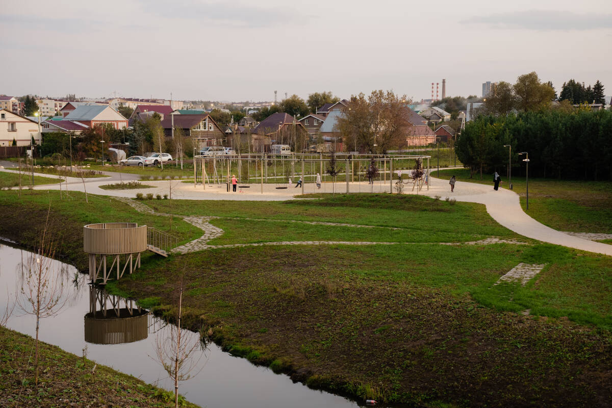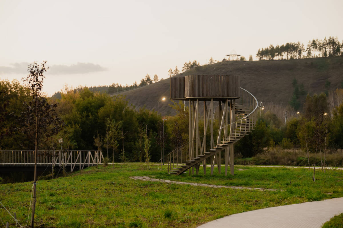 Отдельным акцентом стал Экопарк – продолжение Каскада прудов и благоустроенный участок вдоль измененного русла реки Бигаш. Здесь появились смотровые вышки для наблюдения за птицами, мосты, качели, гриль-зона с навесом и столиками.