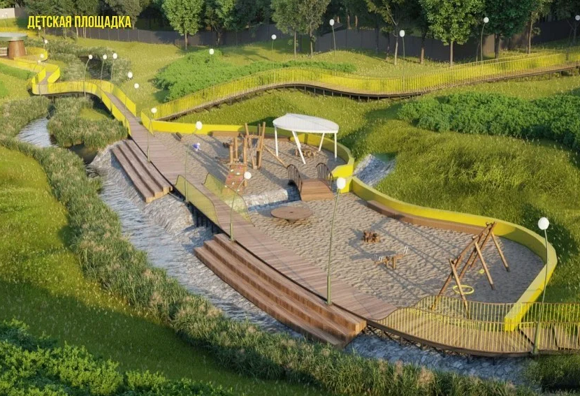 Вдоль ручья предусмотрены функциональные площадки: амфитеатр, зоны отдыха, детская площадка, зона качелей, навес, учтены требования доступности маломобильных групп на основные зоны эко-парка. По всей территории планируется устройство пешеходных дорожек, освещения, малых архитектурных форм, замена моста и создание новых. Также предусматривается реставрация помещения родника. При работе используются только натуральные материалы: дерево, камень и песок.