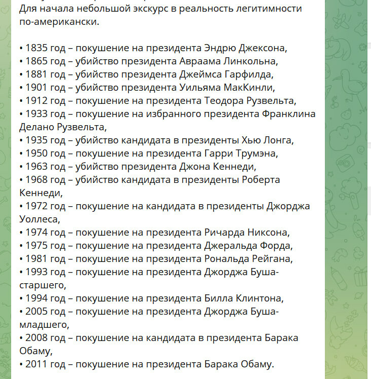 «К этому, например, призвали конгрессмен Дэн Голдман и политолог-публицист Роберт Каган, по совместительству (внезапно!) муж Виктории Нуланд. Если вы полагаете, что это всё просто риторика, то я вам скажу, что это просто история США», — сказала Захарова и перечислила исторические факты касательно покушений и убийств американских президентов.