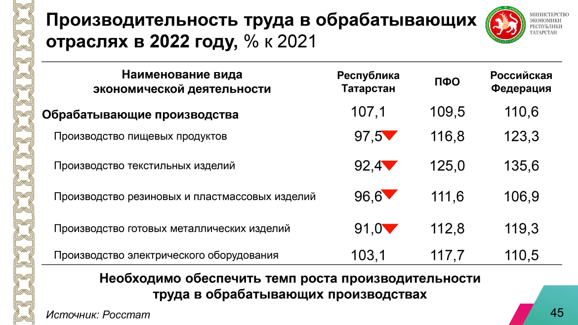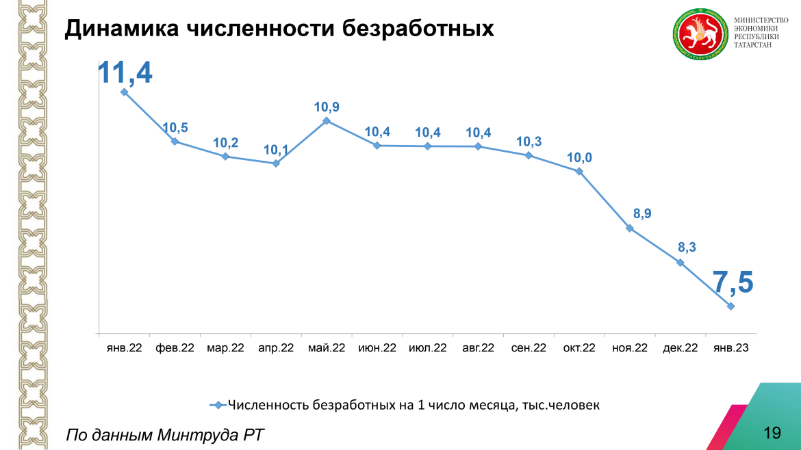 Промышленное производство, как сообщал «Татар-информ», выросло на 6,6%, что сильно выделило Татарстан на общероссийском фоне. Сокращение оборотов в торговле министр объяснил снижением продаж непродовольственных товаров, в частности – автотранспорта. С 11,4 тыс. в январе до 7,5 тыс. в декабре прошлого года сократилось в республике и число безработных.