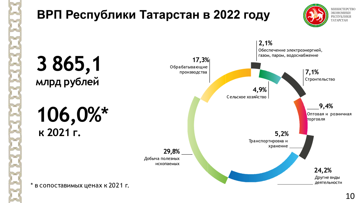 Несмотря на все сложности, которые меньше года назад казались непреодолимыми, год для республики завершился на мажорной ноте. Валовой региональный продукт (ВРП) Татарстана по итогам 2022 года превысил 3,8 трлн рублей – это на 6% больше, чем в 2021 году, в сопоставимых ценах.