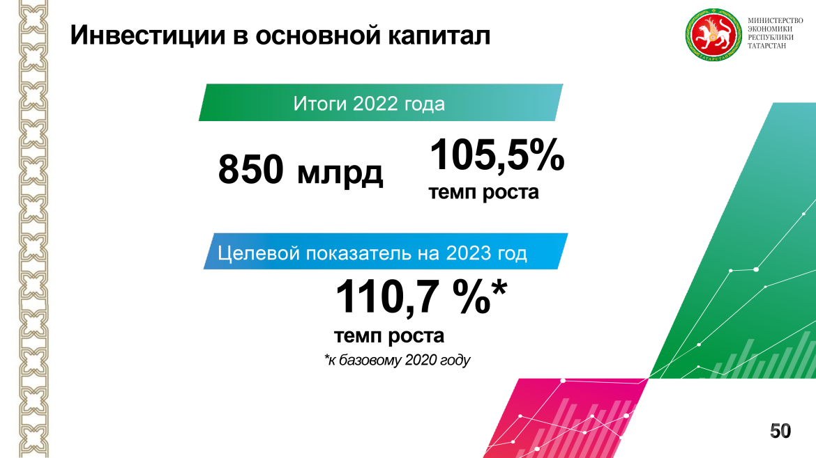 С инвестициями в 2022 году в Татарстане тоже все сложилось позитивно. Оценка, озвученная еще на коллегии АИР РТ, прозвучала и сегодня – рост на 5,5%, до 850 млрд рублей (с учетом бюджетных средств). На 2023 год поставлена амбициозная цель – нарастить инвестиции на 10,7%, правда, почему-то к показателям 2020 года, когда бушевала пандемия.