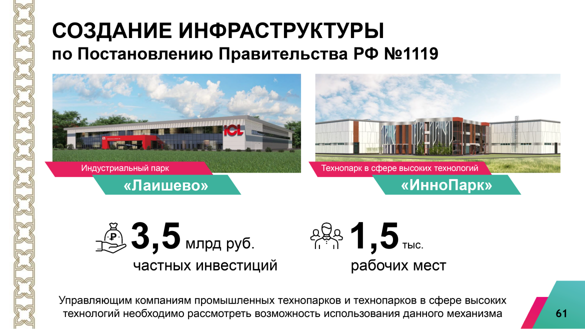 Также притоку инвестиции поможет механизм заключения соглашений о защите и поощрении капиталовложений. Подписано уже три таких документа, на очереди еще один. Вложения на территории Татарстана может простимулировать строительство инфраструктуры для индустриальных парков, о чем недавно говорил глава Альметьевского района Тимур Нагуманов, а также использование ресурсов федеральных институтов развития, от ВЭБа до Фонда развития промышленности.