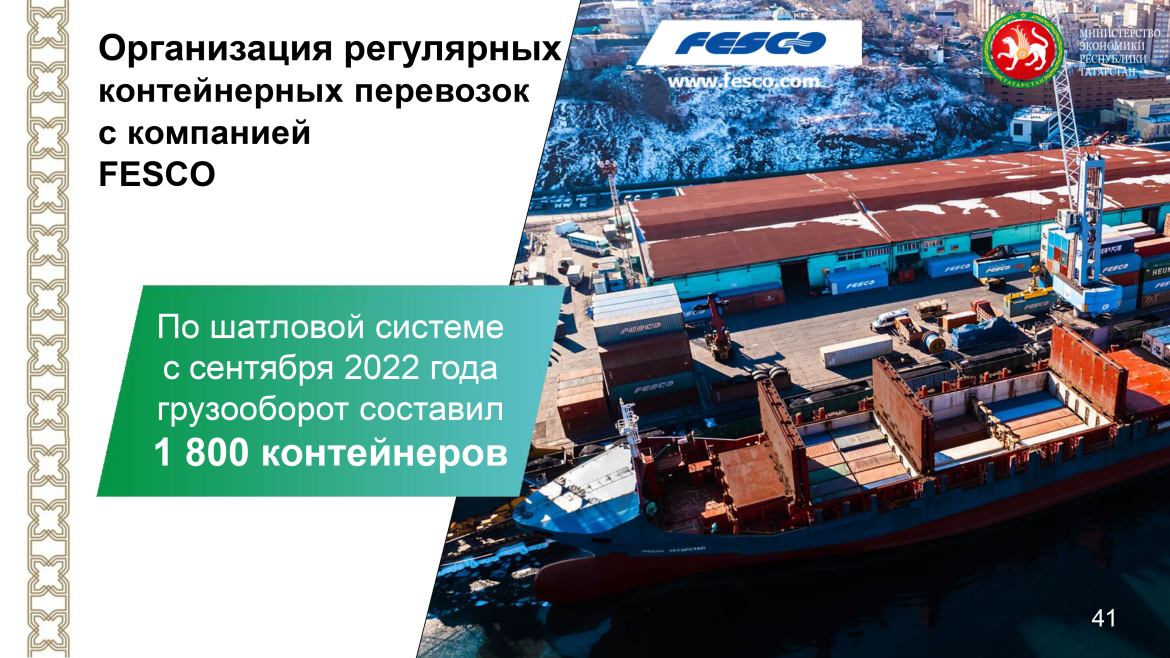 Несмотря на то что экспорт из Татарстана, по оценкам Шагиахметова, за прошлый год вырос почти на треть – до 15,6 млрд долларов, в министерстве уверены, что усиливать потенциал внешней торговли необходимо и далее. Так как логистические потоки стремительно меняются, что приводит к росту затрат, министр напомнил про стартовавший в прошлом году проект с транспортной группой FESCO. Она организовала регулярные контейнерные поезда в Казань из стран Азиатско-Тихоокеанского региона (АТР) – через порт Владивостока, а из стран Ближнего Востока – через порт Новороссийска. Шагиахметов считает, что нужно максимально использовать и новые логистические маршруты, разработанные совместно с филиалами РЖД, работающими на территории Татарстана.
