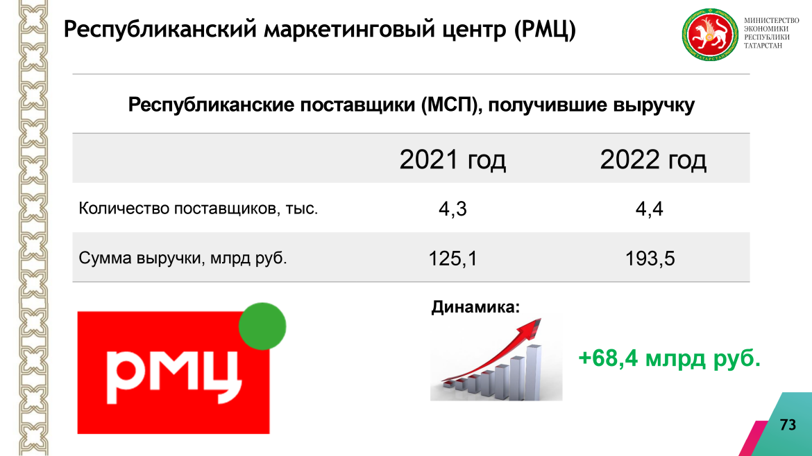 Кроме того, Мидхат Шагиахметов напомнил о возможностях электронных торговых площадок, которыми управляет РМЦ, – в прошлом году выручка резидентов, как сообщал «Татар-информ», превысила 190 млрд рублей. Задача на этот год – нарастить обороты до 210 млрд рублей. Резерв для роста очевиден – пока еще не все районы активно пользуются доступным и простым ресурсом. Среди отстающих – Кайбицкий, Камско-Устьинский, Аксубаевский, Новошешминский и Менделеевский районы. Главам всех муниципалитетов министр рекомендовал не только активно вовлекать предпринимателей на площадки РМЦ, но и обеспечивать закупки. Число резидентов массовых маркетплейсов также планируется увеличить с 45 до 55 тыс.