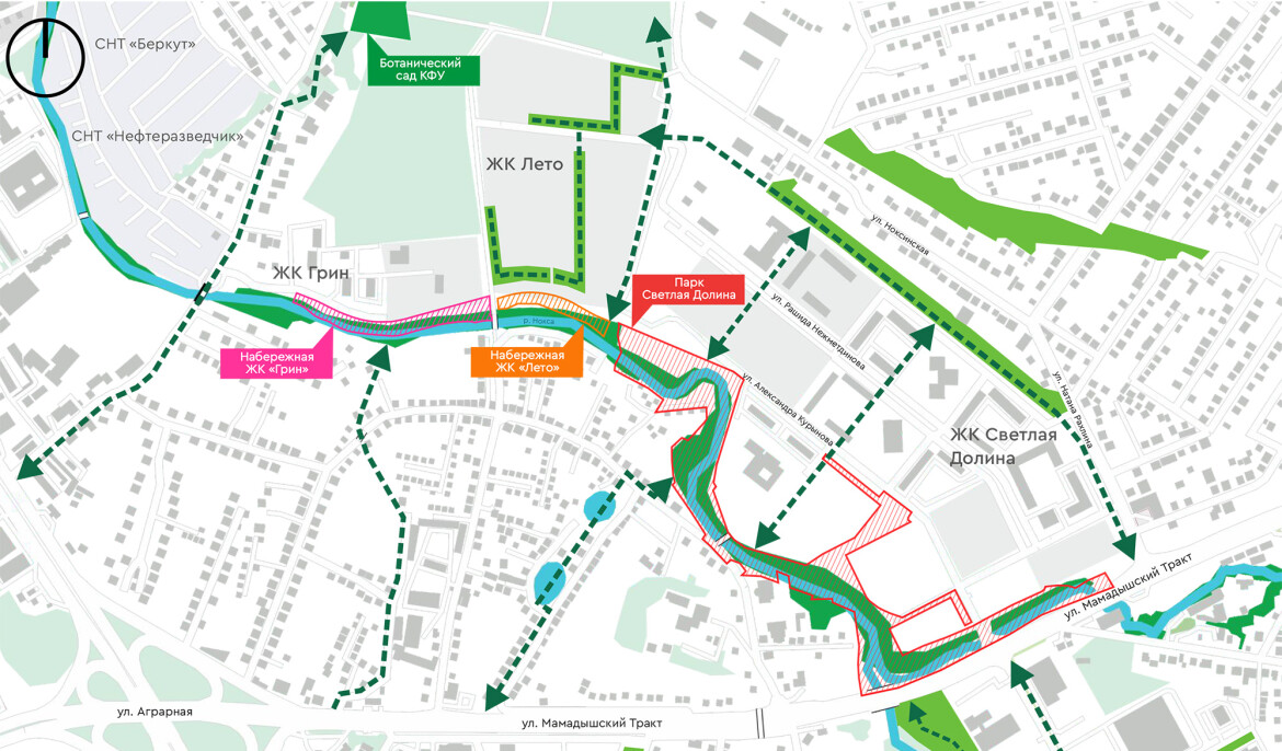 Заместитель генерального директора компании «Ак Барс Девелопмент» (застройщик – «Ак Барс Дом») Илья Лекарев отметил, что уже сейчас жители «Светлой долины» могут неспешно пройтись по бульварам, расположенным внутри комплекса. А в дальнейшем, по завершении строительства парка появится еще одна большая благоустроенная прогулочная зона вдоль реки. Компания профинансировала разработку проектной документации для будущей зеленой зоны.