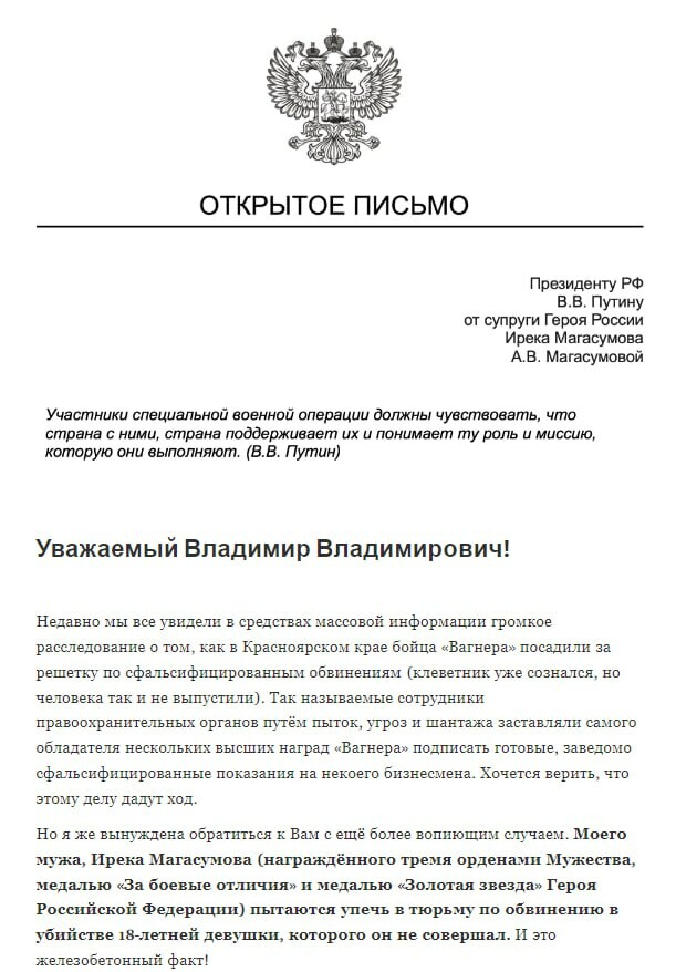 «Я же вынуждена обратиться к Вам с еще более вопиющим случаем. Моего мужа, Ирека Магасумова (награждённого тремя орденами Мужества, медалью «За боевые отличия» и медалью «Золотая звезда» Героя Российской Федерации) пытаются упечь в тюрьму по обвинению в убийстве 18-летней девушки, которого он не совершал. И это железобетонный факт! Дело в том, что ранее в СКР с явкой с повинной дважды обратился военнослужащий, который в действительности произвел выстрел в девушку – Павел Яськевич. Несмотря на то, что он лично пришел и признался в преступлении, следователь просто выбросил документ в мусорное ведро», – пишет она в своем письме.