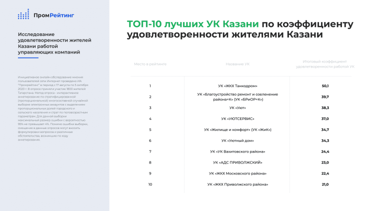 Топ-10 худших УК столицы Татарстана составили «Территория комфорта» с коэффициентом удовлетворенности 8,2, «РАН Сервис», «Заречье», «ЖКХ Авиастроительного района», «Старый город», «ООО „Ремонтсервис“», «Сервис-Гарант», «ЖКХ Дербышки», «Райжилуправления Советского района» и «Жилищник-4».