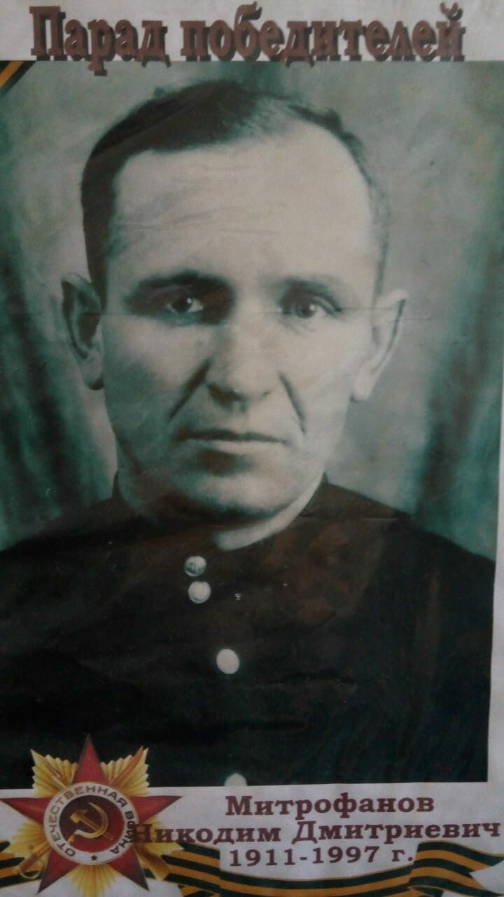 Никодим Митрофанов — участник Ясско-Кишиневской операции. На войне был машинистом паровоза, позже его отправили в минометчики, впоследствии был ранен, но продолжал служить в армии, его перевели в железнодорожные военные войска начальником восстановительной летучки. Дошел до Австрии, был в городе Вена дежурным по депо.