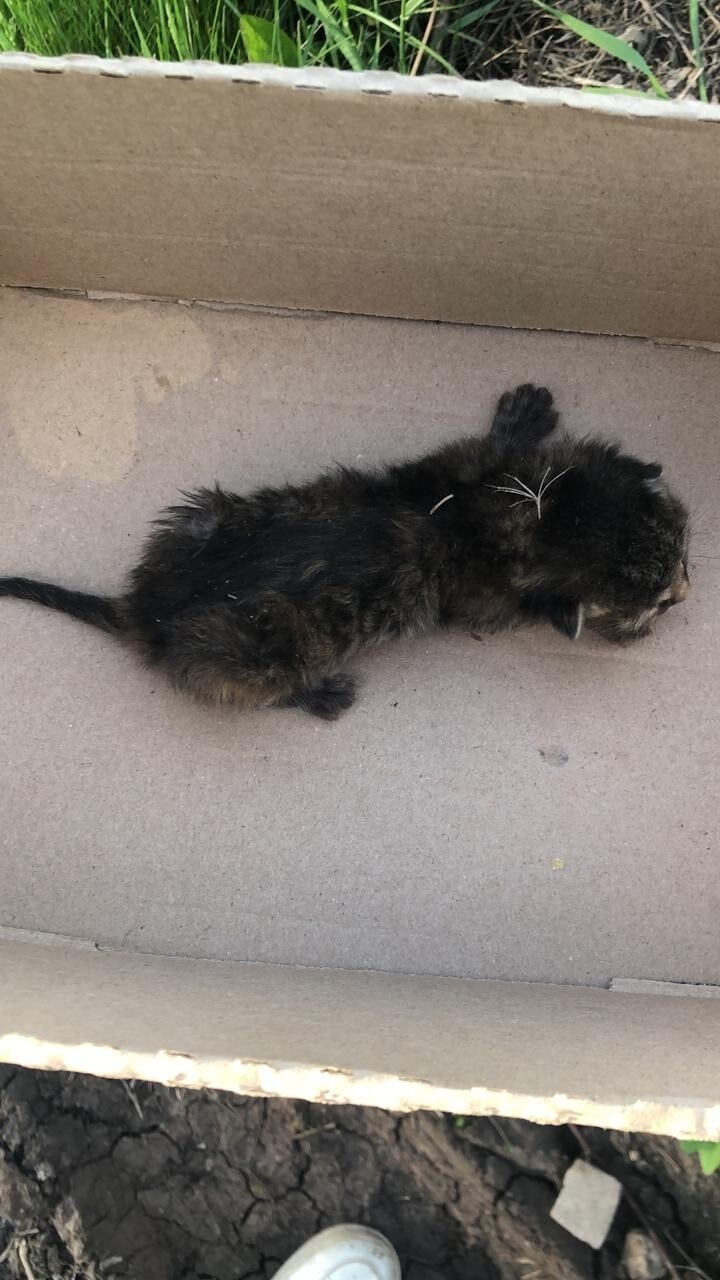На ролике видно, что котенок потрепан и еле двигается. Предположительно, он пробыл в мусорке уже долгое время.
