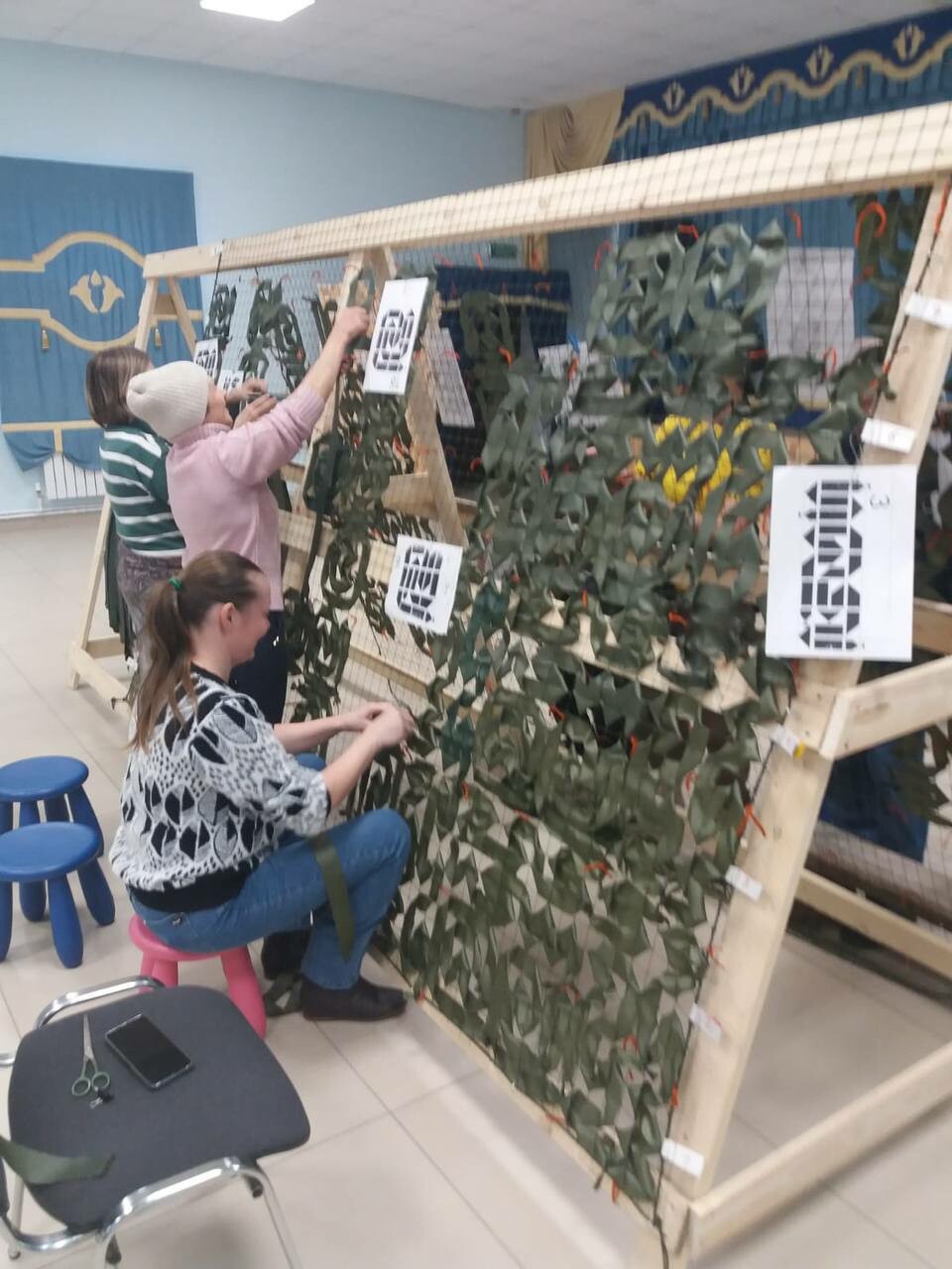 «Плетение организовали в сельском Доме культуры. Площадь зала примерно 200 квадратных метров. Организовал точку активист Тагир Галиев. Пока здесь одна стойка для плетения. В зависимости от волонтеров будут расширяться», — рассказала «Татар-информу» волонтер Юлия Плескач.