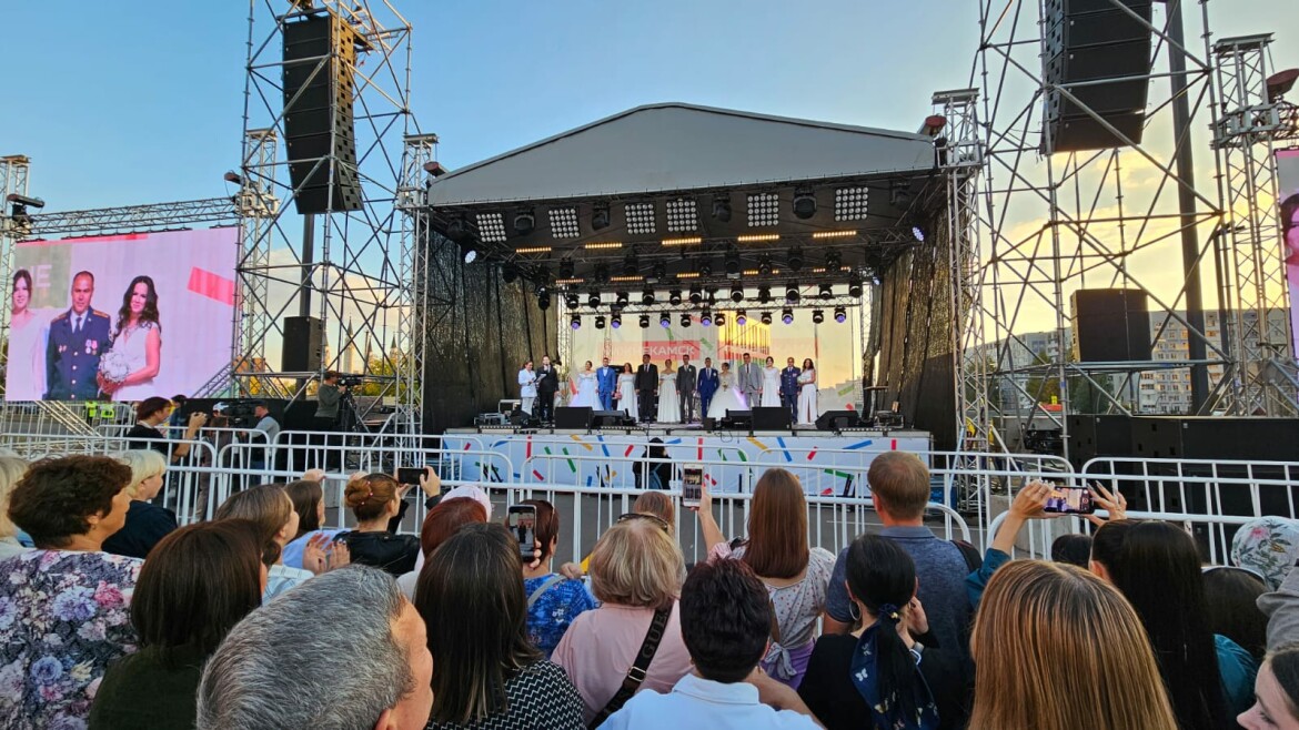 Глава района заметил, что молодые семьи — это украшение праздника. Перед выходом молодоженов на сцену Муллин предупредил: поздравлять их будет весь город, а затем в шутку предостерег от разводов в будущем.
