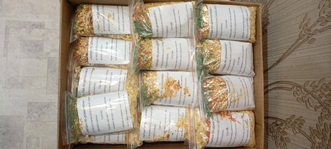 Приготовив с односельчанками лапшу, у волонтеров Атнинского района они научились делать сухие супы. Купив на собранные деньги мясо, прихватив овощи, выращенные в своем огороде, женщины вновь собрались в сельском доме культуры. На этот раз — резать продукты для сухих супов. Эта работа продолжается до сих пор. Нарезанные продукты потом сушат.