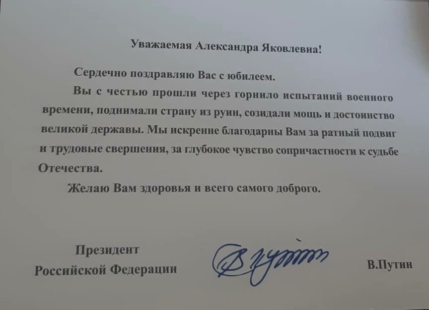 Поздравить долгожительницу с внушительной датой приехали близкие и юнармейцы. Поздравительные телеграммы Александре Яковлевне направили Президент России Владимир Путин и Раис Татарстана Рустам Минниханов. Юнармейцы передали открытку, сделанную своими руками. Также заехал в гости к Александре Яковлевне ее внук, Алексей Герасимов.