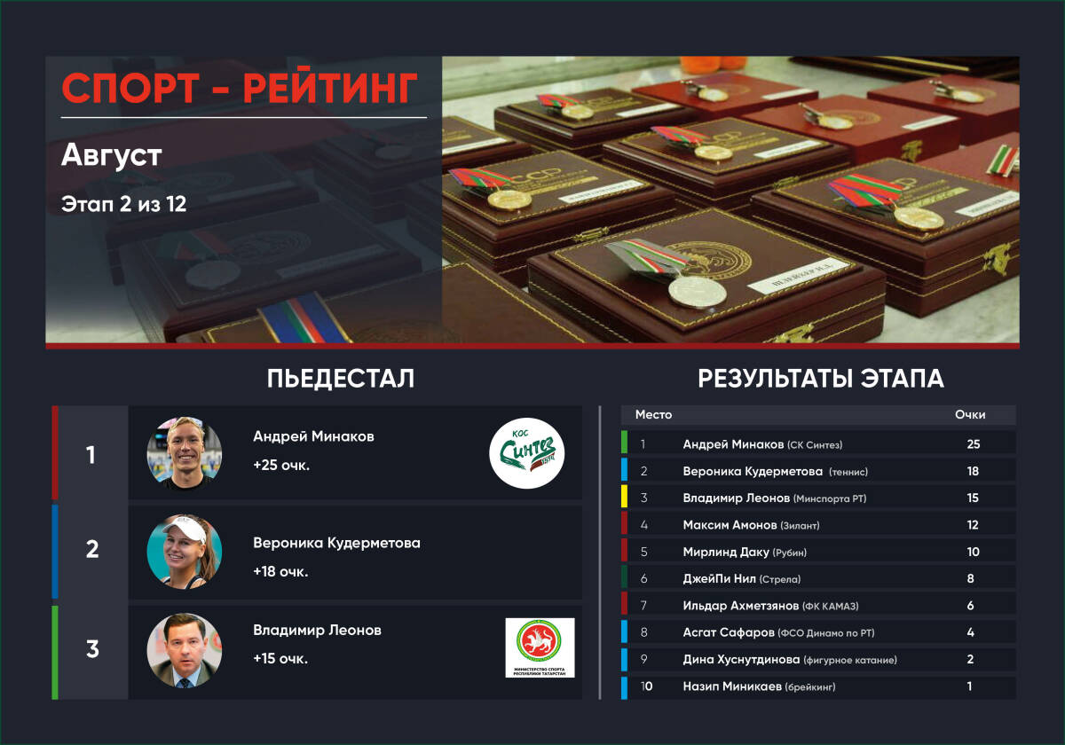 3 августа 2025 года на чемпионате мира по водным видам спорта в Сингапуре пловец сборной Татарстана Андрей Минаков завоевал золото в комбинированной эстафете 4х100 метров в составе российской команды. В республике он выступает за команду СК «Синтез». Таким образом, эта команда и Минаков зарабатывают сразу 25 очков и ярко врываются в наш рейтинг.