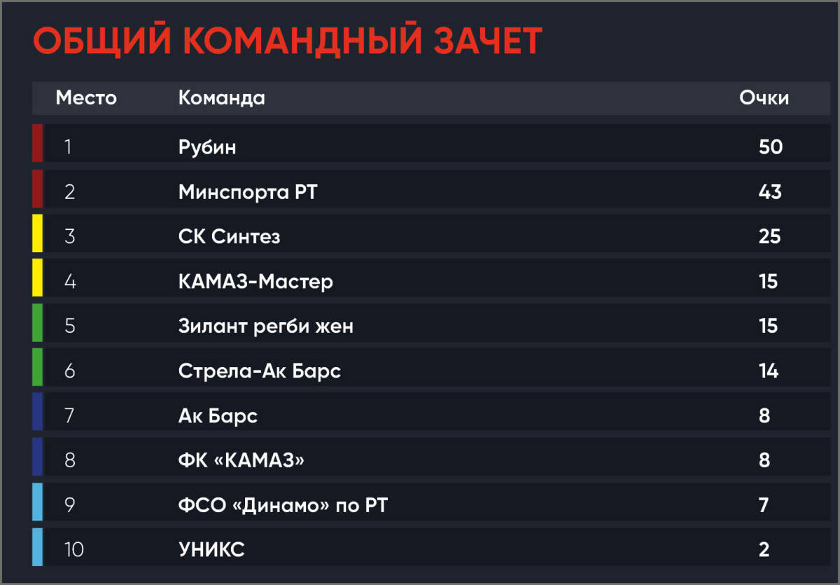 В командном зачете «Рубин» отрывается от конкурентов, пока главным конкурентам в командных видах спорта («Ак Барсу», УНИКСу и «Зенит-Казань») практически нечем похвастаться. Уверенно идет по дистанции Минспорта РТ. В тройку лучших втиснулись «пловцы» из СК «Синтез». К тому же бросается в глаза большое представительство регбистов.
