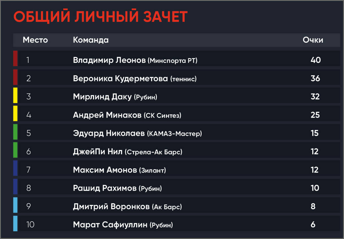 10 очков позволили Даку по итогам двух этапов рейтинга войти в топ-3 личного зачета. А «Рубин», благодаря голосам болельщиков, на 8 очков оторвался от Минспорта РТ. Сейчас вы можете проголосовать уже по результатам августа. На сайте «Татар-информа» и в телеграм-канале «ТИ-Спорта».