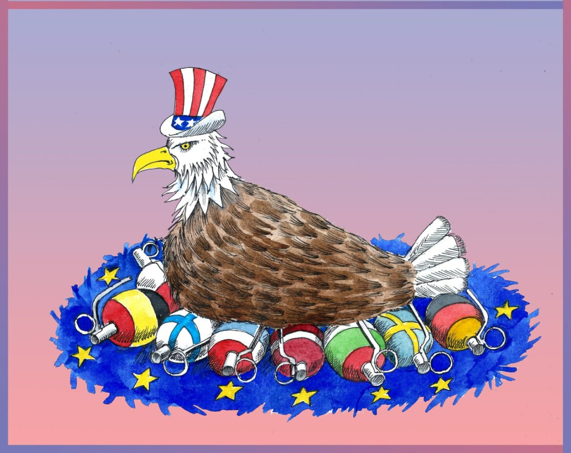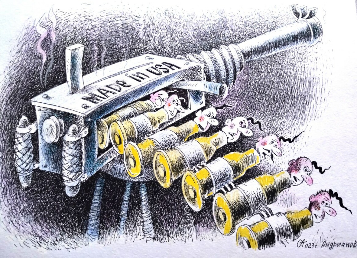 Другая карикатура показывает украинских солдат, изображенных в стереотипно «запорожском» виде (как в позднесоветском цикле мультфильмов «Казаки»), в качестве снарядов для произведенного в США орудия. На третьей изображены Соединенные Штаты в виде их традиционного символа — белоголового орлана: птица высиживает гранаты, окрашенные в цвета стран — членов Европейского Союза (о флаге которого напоминают цвета гнезда).