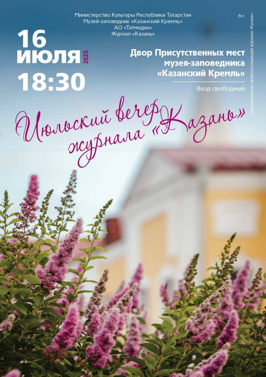 16 июля в 18:30 во дворе Присутственных мест Казанского Кремля снова прозвучат стихи, музыка и живое слово — журнал «Казань» продолжает традицию «Летних вечеров» с презентацией нового июльского выпуска. Уютное пространство под открытым небом давно стало любимым местом встреч для читателей из Казани и гостей города, приходящих целыми семьями.