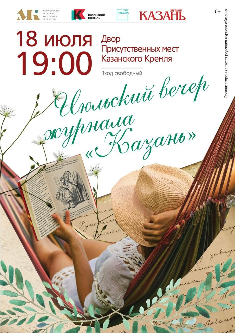 Серию летних вечеров продолжает журнал «Казань» и приглашает всех желающих на Июльский вечер, который уже по традиции пройдет во Дворе Присутственных мест Казанского Кремля. Мероприятие состоится 18 июля, начало запланировано на 19.00.
