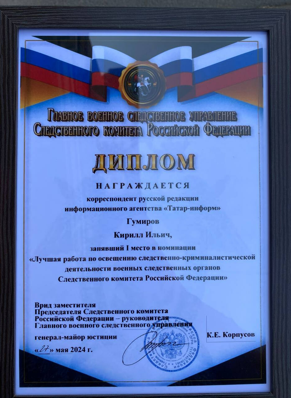 Журналист информационного агентства «Татар-информ» Кирилл Гумиров занял первое место в номинации «Лучшая работа по освещению следственно-криминалистической деятельности военных следственных органов Следственного комитета РФ».