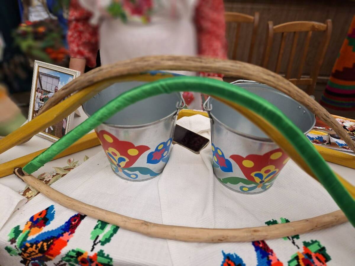 Рядом расположилась выставка расписных татарских коромысел. Их изготавливает 86-летний житель села Подгорный Байлар Накип Шайхетдинов. Коромысло здесь использовали не только для того, чтобы ходить на родник за водой, но и при сборе ягод, в быту. Сегодня увидеть их можно во время традиционных обрядов на сельских свадьбах.