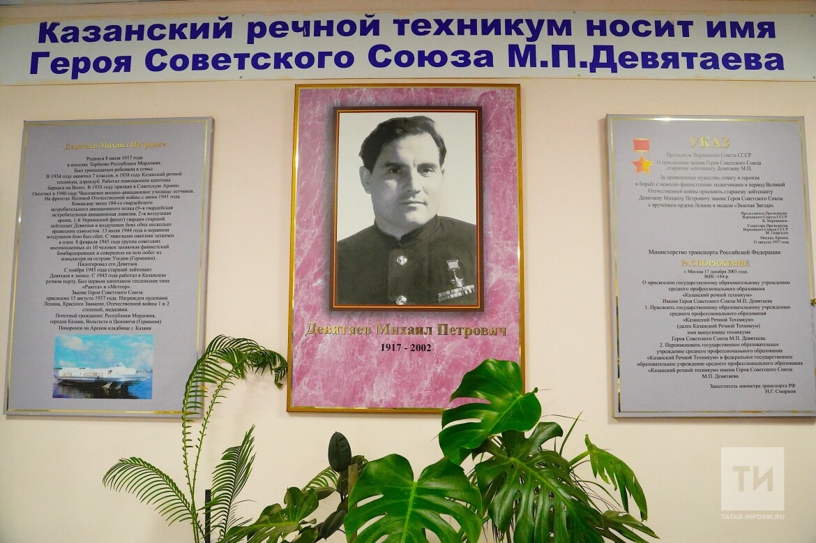 На фасаде Казанского филиала Волжского государственного университета водного транспорта (Несмелова, 7) сегодня была открыта мемориальная доска летчику-истребителю, Герою Советского Союза Михаилу Девятаеву